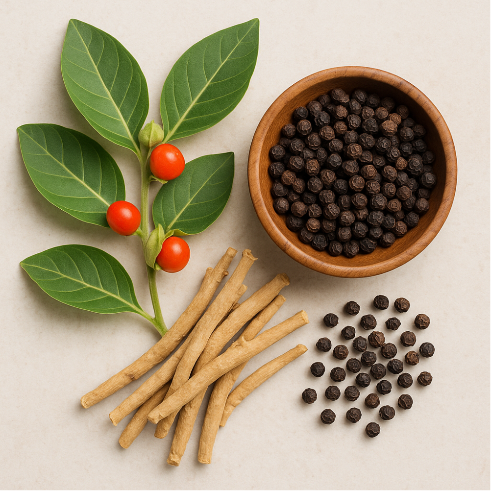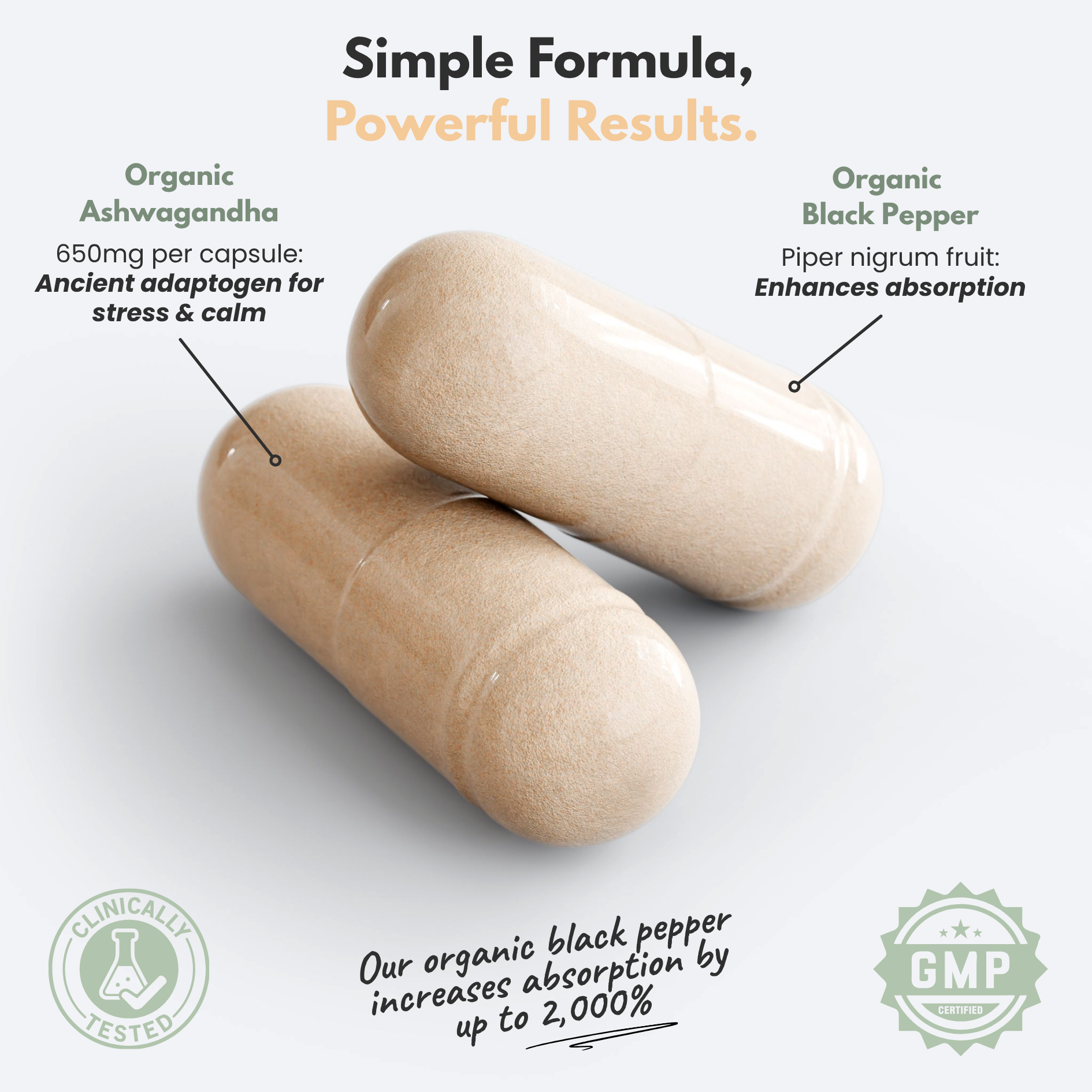 Our simple two-ingredient formula combines Organic Ashwagandha (Withania somnifera)—an ancient adaptogen clinically shown to reduce stress, lower cortisol levels, support mental clarity and restful sleep—with Organic Black Pepper (Piper nigrum) to dramatically enhance absorption by up to 2000% and provide antioxidant protection. Together, they help your body adapt to daily stressors, calm an overactive mind, and restore the natural balance that modern life so often disrupts. The result is a calmer, more centered you—able to handle life's challenges with greater ease, clearer focus, and more resilience. Calm+ provides a foundation for sustainable well-being.