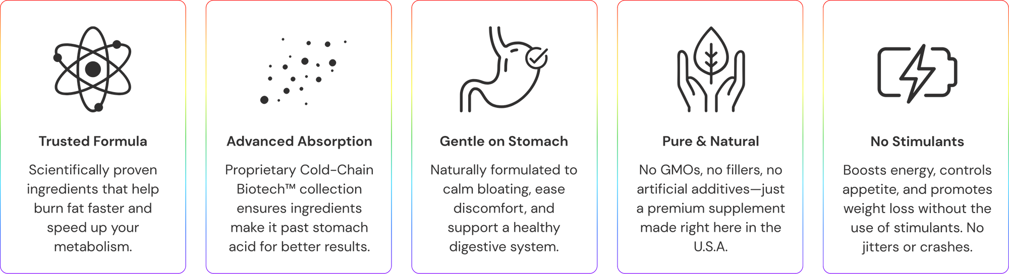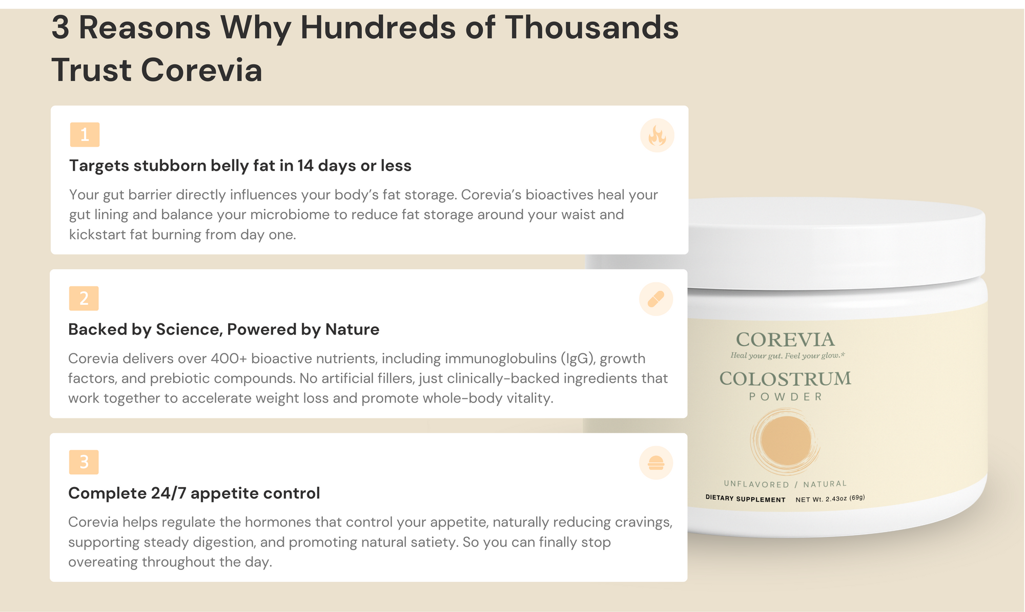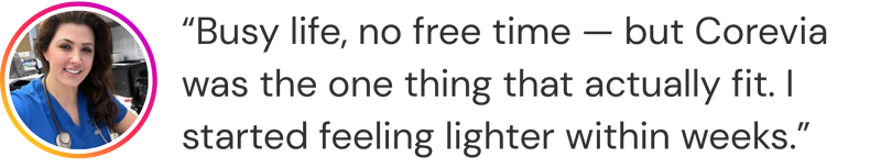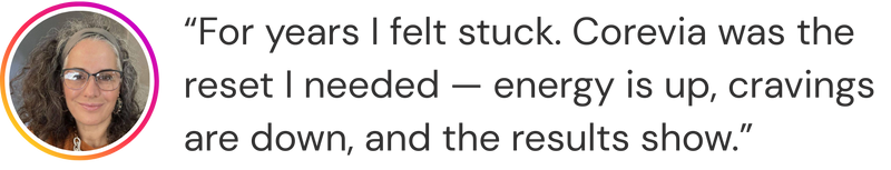 Corevia isn’t a fat burner or a weight-loss powder. It’s a premium colostrum formula crafted to help strengthen the gut barrier, ease bloating, restore whole-body vitality, and support your body’s natural fat-burning rhythm. When your gut is repaired, the body can better regulate appetite, energy, and metabolism. Unlike fat-burning powders, Corevia contains zero stimulants — so you won’t deal with jitters, crashes, nausea, dizziness, or headaches commonly associated with those products.