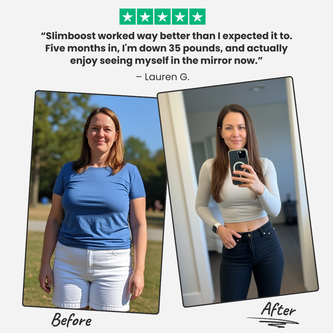 SlimBoost changed everything. In just four months, I lost 34 pounds—without crashes or extreme diets. My appetite is under control for the first time in years, the constant food noise in my head is completely gone, and I genuinely feel confident when I catch my reflection now. This time, the weight stayed off because I wasn't white-knuckling through hunger anymore. SlimBoost gave me the reset I desperately needed."