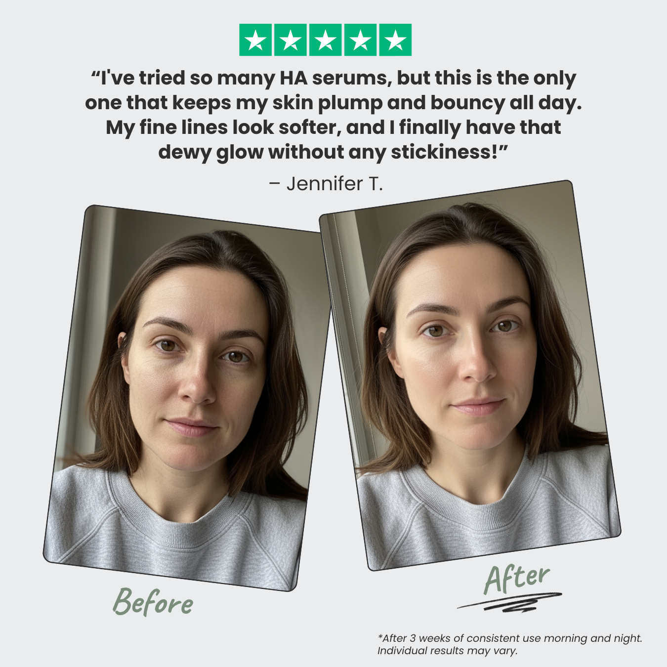 Our advanced multi-phase serum delivers four molecular weights of Hyaluronic Acid to hydrate skin at every level—from surface to dermis. Sodium Hyaluronate Crosspolymer and Sodium Hyaluronate cushion and plump the outer layers, visibly softening fine lines. Sodium Acetylated Hyaluronate penetrates deeper to restore elasticity, while Hydrolyzed Sodium Hyaluronate—the smallest molecule—locks moisture into the deepest layers for lasting bounce and suppleness.